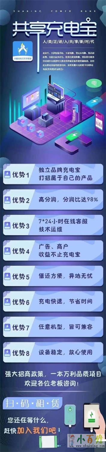 1.超低的行业准入门槛,3万元就可打造属于自己的共享充电宝品牌,拥有自己的品牌管理系统,品牌logo的柜机,品牌招商电话等,为您后续的发展埋下伏笔YZW。 2.实现多品牌多机柜借还,只要有“充电宝联盟”标识柜机都可以实现互通,品牌之间可以互还,实现真正的共享租借、归还。解决小品牌充电宝布局不够密集,用户归还难,导致用户使用率低的问题 3.完善的售前售后培训,一对一辅导,设备网点的选择,铺设话术,商家以及业务员提成比例的合理分配,网点的设备投放适宜数量,怎样快速回笼资金等全方面的教学,让你的运营不再是个难题,哪怕是新手上路,也能快速适应这个新兴行业小 生 活 网。 4.联盟进行统一运营售后管理,整合资源,提供技术、客服等全方位支持,统一处理所有的系统售后问题,减少售前、售后繁琐的流程与成本。 5.比大品牌更低的拿货门槛,让你的成本一降再降,不再担心大品牌打价格战,数量战来源www.xbaixing.com。 6.比大平台更多的产品线可供选择,同时,也能覆盖更多的使用场景,利用有利优势抢占更多的网点. 7.更低的行业准入成本。传统的进入充电宝行业的需要投入大量的资金,开模,订机等,至少上百万的打底成本,而现在共享联盟只需要几万的资金投入x_b_a_i_x_i_n_g_c_o_m。 8.**的优势:领先于行业的系统完善时间,发展趋势分析。因为联盟成员众多,对于共享充电宝行业整体的发展趋势的敏感程度将会远远高于单一品牌的理解小生活网。告别单个品牌问题反馈延缓,发展完善缓慢的问题。掌握了趋势,就掌握了主动权,在迎接风口的时候就会有充足的准备!!! 微信手机同号“15925603578”