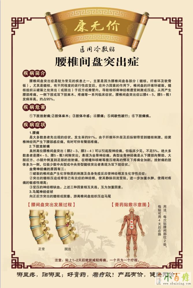 二十年来这腰椎病折磨得老何身心疲惫,经济枯竭。万念俱灰之时,经人推荐用了康无价医用冷敷贴,短短数日的敷贴就彻底颠覆了老何的病情www.xbaixing.com小百姓网。