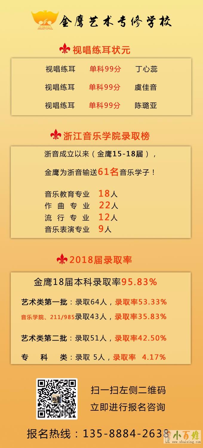 杭州金鹰艺术专修学校经过十余年的努力,已经走在了音乐类艺考培训的前列来自www.xbaixing.com。在音乐统考视唱练耳单科中,金鹰3位长期班学员丁心蕊、虞佳音、陈璐亚取得99分状元(满分100分),这是界内少有的成绩!