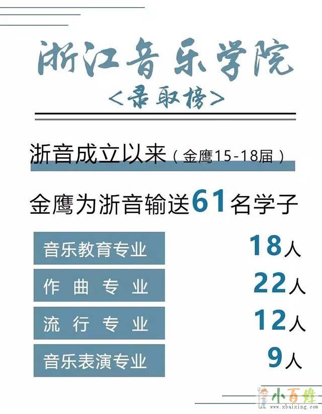 浙江音乐学院成立以来,金鹰艺术专修学校15届-18届为浙音输送61名学子,其中音乐教育专业18人、作曲专业22人、流行专业12人、音乐表演专业9人小.百.姓.网。就读于浙江音乐学院的18届金鹰学员邢晗铭参加《中国好声音》,成功加入李荣浩战队;金鹰学员黄复旦参加优酷原创音乐节目《这!就是歌唱·对唱季》,8月24日发行合唱单曲《MMA》;金鹰学员孙旖璐和李梦甜凭借《牡丹遗梦》获浙江音乐学院微电影二等奖。