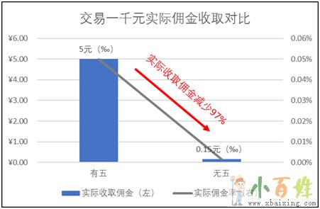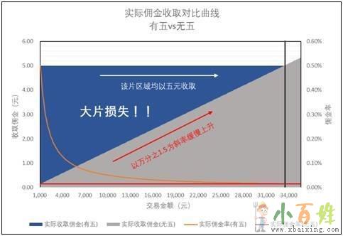 在一定的交易金额以内,有五账户的实际收取佣金均为5元,实际佣金率随着交易金额的上升才从千五缓慢收敛至名义佣金率,投资者将蒙受上图蓝色区域中大片的潜在手续费损失!而无五账户的实际收取佣金则以名义佣金率为斜率缓慢上升,实际佣金率即为名义佣金率