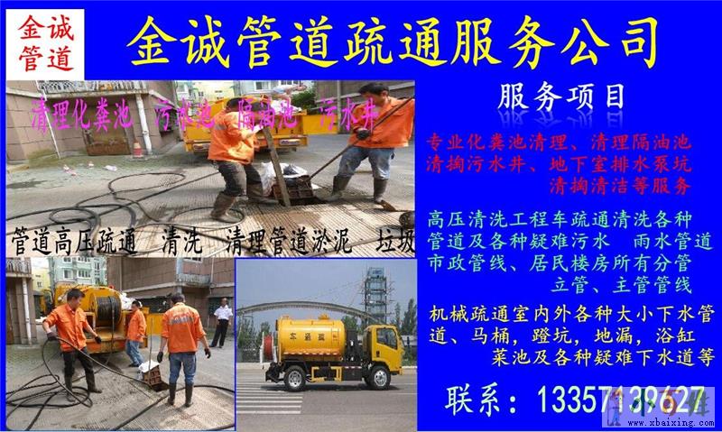 4、排污沟疏通:专业各种大型地下排污沟疏通(因为泥沙、砖头、垃圾等硬物造成的堵塞)我们会使用不同的工具使排污通水顺畅!! 小百姓网www.xbaixing.com