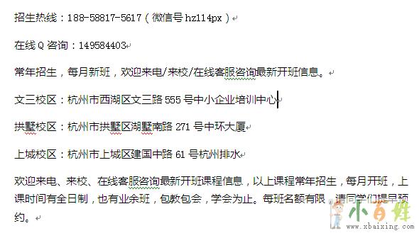欢迎来电、来校、在线客服咨询最新开班课程信息,以上课程常年招生,每月开班,上课时间有全日制,也有业余班,包教包会,学会为止。每班名额有限,请同学们提早预约x.b.a.i.x.i.n.g.c.o.m。