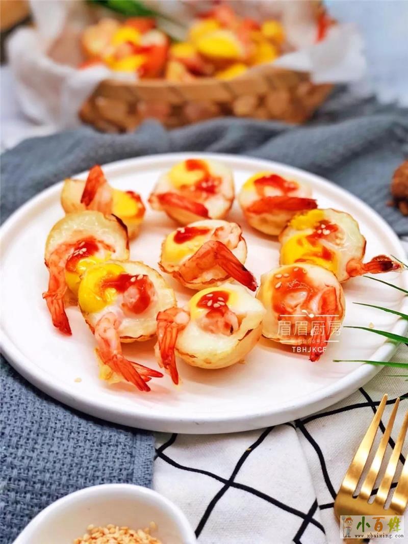 3也用刷子把刚才调好的面糊刷上去,转成小火再放入一个一个虾上去,虾尾朝上摆放。鹌鹑蛋也是一个一个磕放在虾上面,上面撒一些海苔碎、沙拉酱上去。